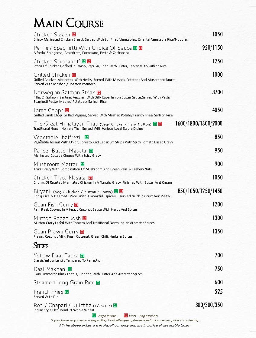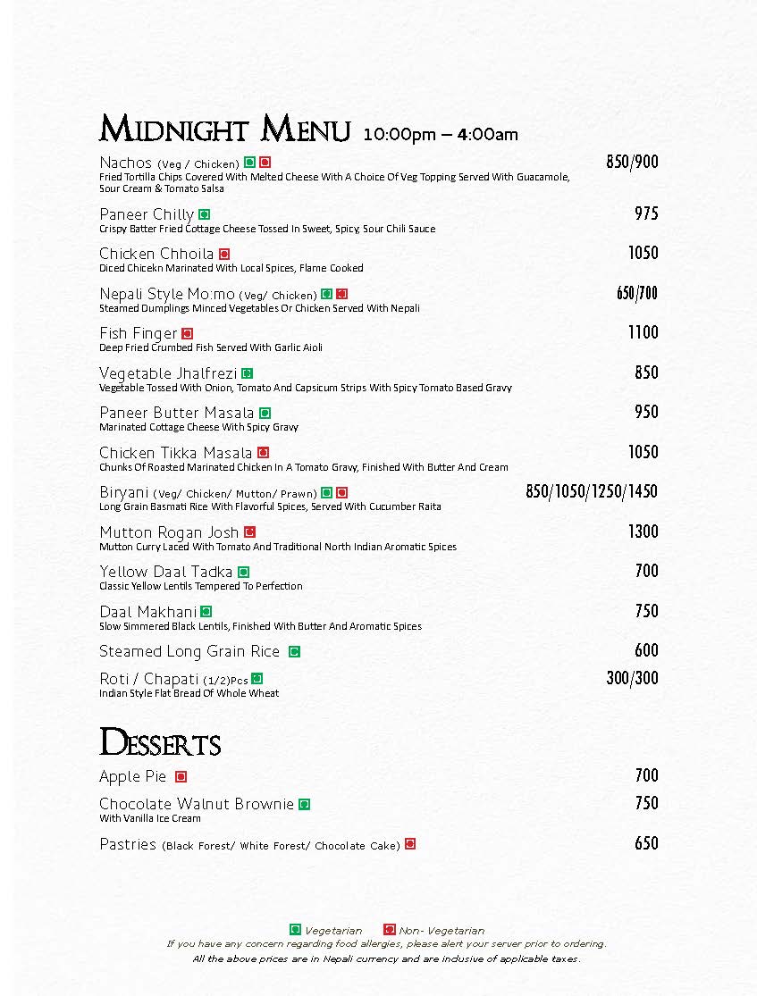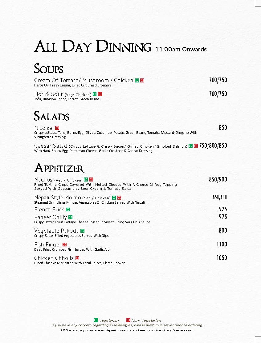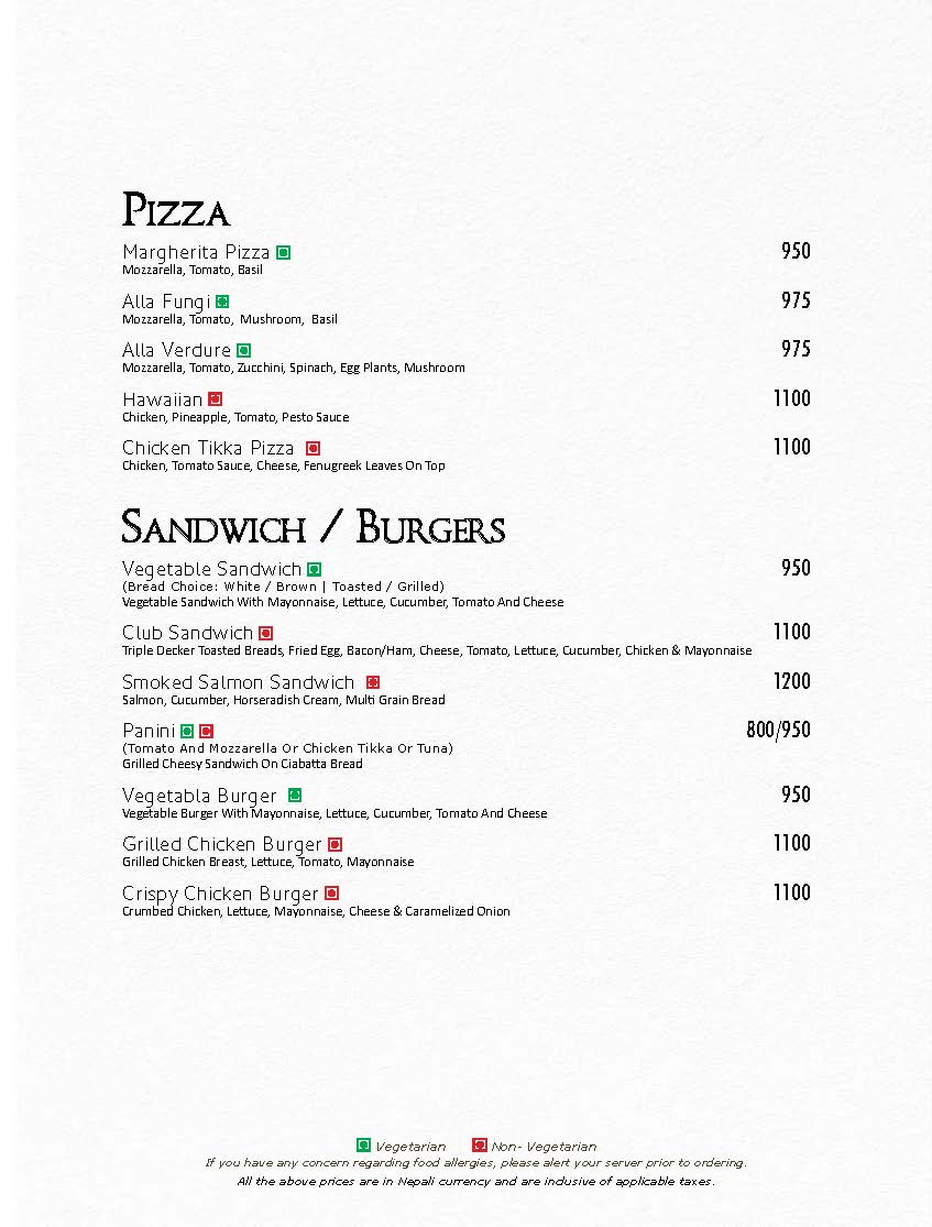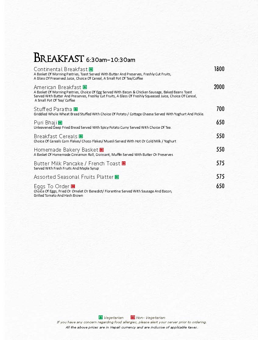 In Room Dining Menu